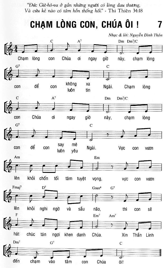 1. Chạm lòng con Chúa ơi ngay giờ này, chạm lòng con để con không xa Ngài. Chạm lòng con Chúa ơi ngay giờ này, chạm lòng con để con say mê Ngài. Vực con vươn lên khỏi chốn tối tăm tuyệt vọng, vực con vươn lên khỏi nghi ngờ và sầu não, thì con sẽ hát chúc tán ngợi khen danh Chúa. Xin Thần Linh đến chạm vào tâm con Chúa ôi!