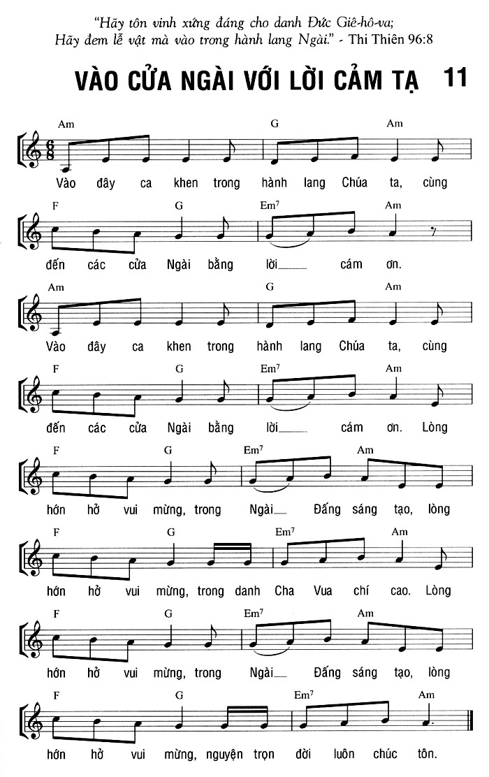 1. Vào đây ca khen trong hành lang Chúa ta, cùng đến các cửa Ngài bằng lời cám ơn. Lòng hớn hở vui mừng, trong Ngài Đấng sáng tạo, lòng hớn hở vui mừng, nguyện trọn đời luôn chúc tôn. 2. Vào đây ca khen trong hành lang Chúa ta, cùng đến các cửa Ngài bằng lời cám ơn. Lòng hớn hở vui mừng, trong danh Cha Vua chí cao. Lòng hớn hở vui mừng, nguyện trọn đời luôn chúc tôn. 3. Vào đây ca khen trong hành lang Chúa ta, cùng đến các cửa Ngài bằng lời cám ơn. Lòng hớn hở vui mừng, trong Ngài Đấng sáng tạo, lòng hớn hở vui mừng, nguyện trọn đời luôn chúc tôn. Điệp khúc: Vào đây ca khen trong hành lang Chúa ta, cùng đến các cửa Ngài bằng lời cám ơn. Lòng hớn hở vui mừng, trong Ngài Đấng sáng tạo, lòng hớn hở vui mừng, nguyện trọn đời luôn chúc tôn.