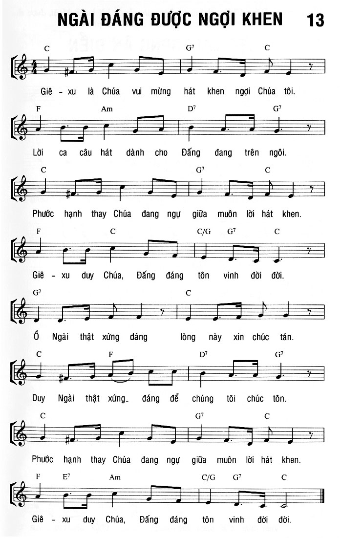1. Giê-xu là Chúa vui mừng hát khen ngợi Chúa tôi. Lời ca câu hát dành cho Đấng đang trên ngôi. Phước hạnh thay Chúa đang ngự giữa muôn lời hát khen. Giê-xu duy Chúa, Đấng đáng tôn vinh đời đời. 2. Ổ Ngài thật xứng đáng lòng này xin chúc tán. Duy Ngài thật xứng đáng để chúng tôi chúc tôn. Phước hạnh thay Chúa đang ngự giữa muôn lời hát khen. Giê-xu duy Chúa, Đấng đáng tôn vinh đời đời.