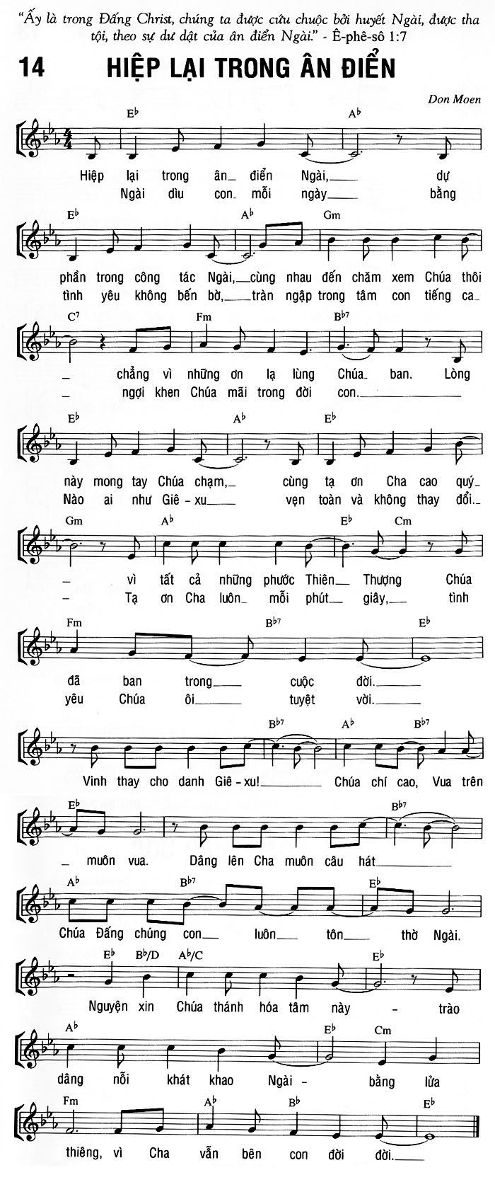1. Hiệp lại trong ân điển Ngài, dự phần trong công tác Ngài, cùng nhau đến chăm xem Chúa thôi chẳng vì những ơn lạ lùng Chúa ban. Lòng này mong tay Chúa chạm, vì tất cả những phước Thiên Thượng đã ban trong cuộc đời. Vinh thay cho danh Giê-xu! Chúa chí cao, Vua trên muôn vua. Dâng lên Cha muôn câu hát. Chúa Đấng chúng con luôn tôn thờ Ngài. Nguyện xin Chúa thánh hóa tâm này dâng nỗi khát khao Ngài bằng lửa thiêng, vì Cha vẫn bên con đời đời. 2. Ngài dìu con mỗi ngày bằng tình yêu không bến bờ, tràn ngập trong tâm con tiếng ca ngợi khen Chúa mãi trong đời con. Nào ai như Giê-xu vẹn toàn và không thay đổi. Tạ ơn Cha luôn mỗi phút giây, tình yêu Chúa ôi tuyệt vời. Vinh thay cho danh Giê-xu! Chúa chí cao, Vua trên muôn vua. Dâng lên Cha muôn câu hát. Chúa Đấng chúng con luôn tôn thờ Ngài. Nguyện xin Chúa thánh hóa tâm này dâng nỗi khát khao Ngài bằng lửa thiêng, vì Cha vẫn bên con đời đời.