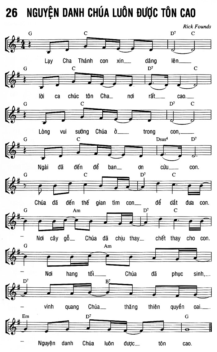 1. Lạy Cha Thánh con xin dâng lên lời ca chúc tôn Cha nơi rất cao. Lòng vui sướng Chúa ở trong con, Ngài đã đến để ban ơn cứu con. Chúa đã đến thế gian tìm con để dắt đưa con. Nơi cây gỗ Chúa đã chịu thay chết thay cho con. Nơi hang tối Chúa đã phục sinh, vinh quang Chúa thăng thiên quyền oai. Điệp khúc: Nguyện danh Chúa luôn được tôn cao.