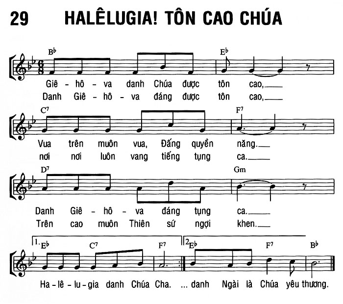 1. Giê-hô-va danh Chúa được tôn cao, Vua trên muôn vua, Đấng quyền năng. Danh Giê-hô-va đáng tụng ca. Ha-lê-lu-gia danh Chúa Cha. 2. Danh Giê-hô-va đáng được tôn cao, nơi nơi luôn vang tiếng tụng ca. Trên cao muôn Thiên Sứ ngợi khen. ... danh Ngài là Chúa yêu thương.