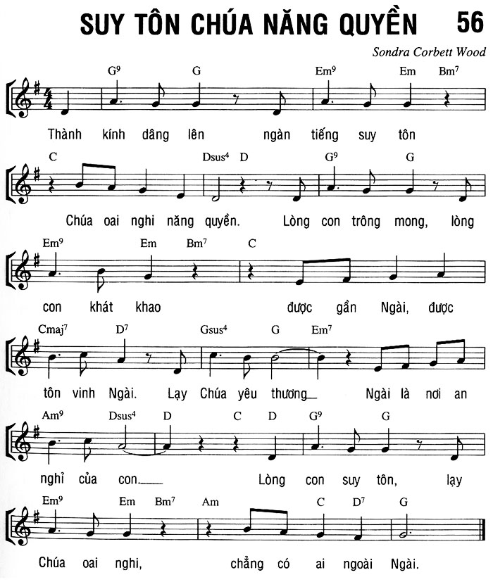 1. Thành kính dâng lên ngàn tiếng suy tôn Chúa oai nghi năng quyền. Lòng con trông mong, lòng con khát khao được gần Ngài, được tôn vinh Ngài. Lạy Chúa yêu thương Ngài là nơi an nghỉ của con. Lòng con suy tôn, lạy Chúa oai nghi, chẳng có ai ngoài Ngài.