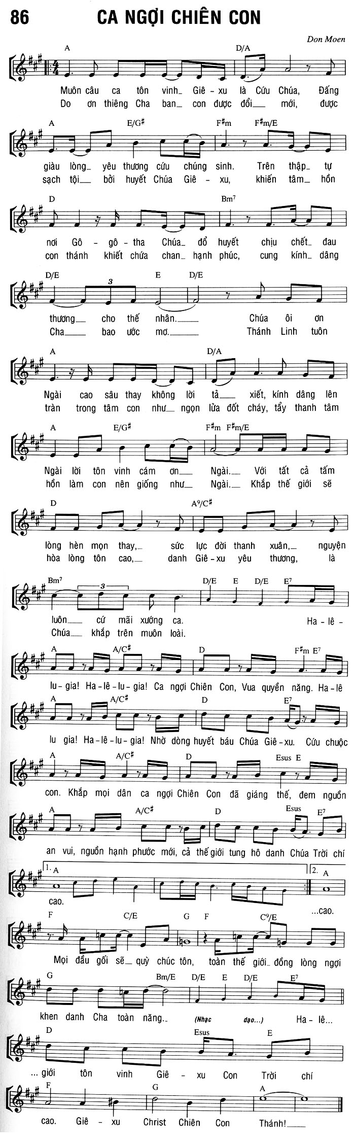 1. Muôn câu ca tôn vinh Giê-xu là Cứu Chúa, Đấng giàu lòng yêu thương cứu chúng sinh. Trên thập tự nơi Gô-gô-tha Chúa đổ huyết chịu chết đau thương cho thế nhân. Ngài cao sâu thay không lời tả xiết, kính dâng lên Ngài lời tôn vinh cám ơn Ngài. Với tất cả tấm lòng hèn mọn thay, sức lực đời thanh xuân, nguyện luôn cứ mãi xướng ca. an vui, nguồn hạnh phước mới, cả thế giới tung hô danh Chúa Trời chí cao. 2. Do ơn thiêng Cha ban con được đổi mới, được sạch tội bởi huyết Chúa Giê-xu, khiến tâm hồn con thánh khiết chứa chan hạnh phúc, cung kính dâng Cha bao ước mơ. Thánh Linh tuôn tràn trong tâm con như ngọn lửa đốt cháy, tẩy thanh tâm hồn làm con nên giống như Ngài. Khắp thế giới sẽ hòa lòng tôn cao, danh Giê-xu yêu thương, là Chúa khắp trên muôn loài. cao. Điệp khúc: Ha-lê-lu-gia! Ha-lê-lu-gia! Ca ngợi Chiên Con, Vua quyền năng. Ha-lê-lu-gia! Ha-lê-lu-gia! Nhờ dòng huyết báu Chúa Giê-xu. Cứu chuộc con. Khắp mọi dân ca ngợi Chiên Con đã giáng thế, đem nguồn Mọi đầu gối sẽ quỳ chúc tôn, toàn thế giới đồng lòng ngợi khen danh Cha toàn năng. (Nhạc dạo...) Ha-lê... giới tôn vinh Giê-xu Con Trời chí cao. Giê-xu Christ Chiên Con Thánh!