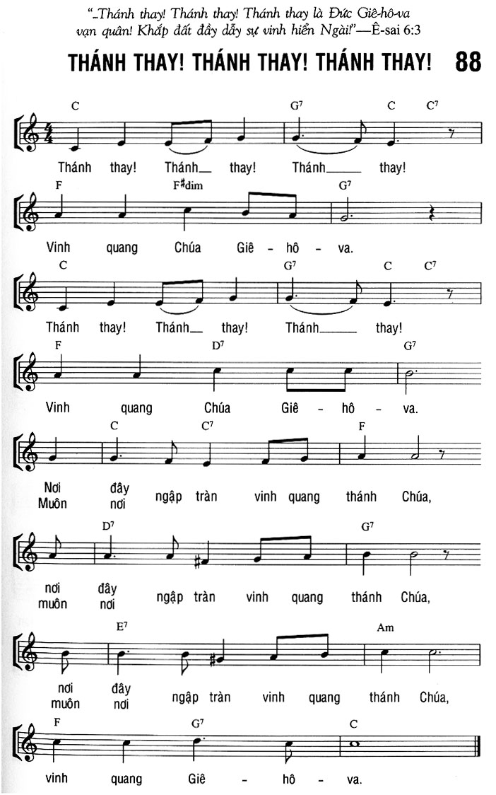 1. Thánh thay! Thánh thay! Thánh thay! Vinh quang Chúa Giê-hô-va. Nơi đây ngập tràn vinh quang thánh Chúa, vinh quang Giê-hô-va. 2. Thánh thay! Thánh thay! Thánh thay! Vinh quang Chúa Giê-hô-va. Muôn nơi ngập tràn vinh quang thánh Chúa, vinh quang Giê-hô-va. 3. Thánh thay! Thánh thay! Thánh thay! Vinh quang Chúa Giê-hô-va. Muôn nơi ngập tràn vinh quang thánh Chúa, vinh quang Giê-hô-va.