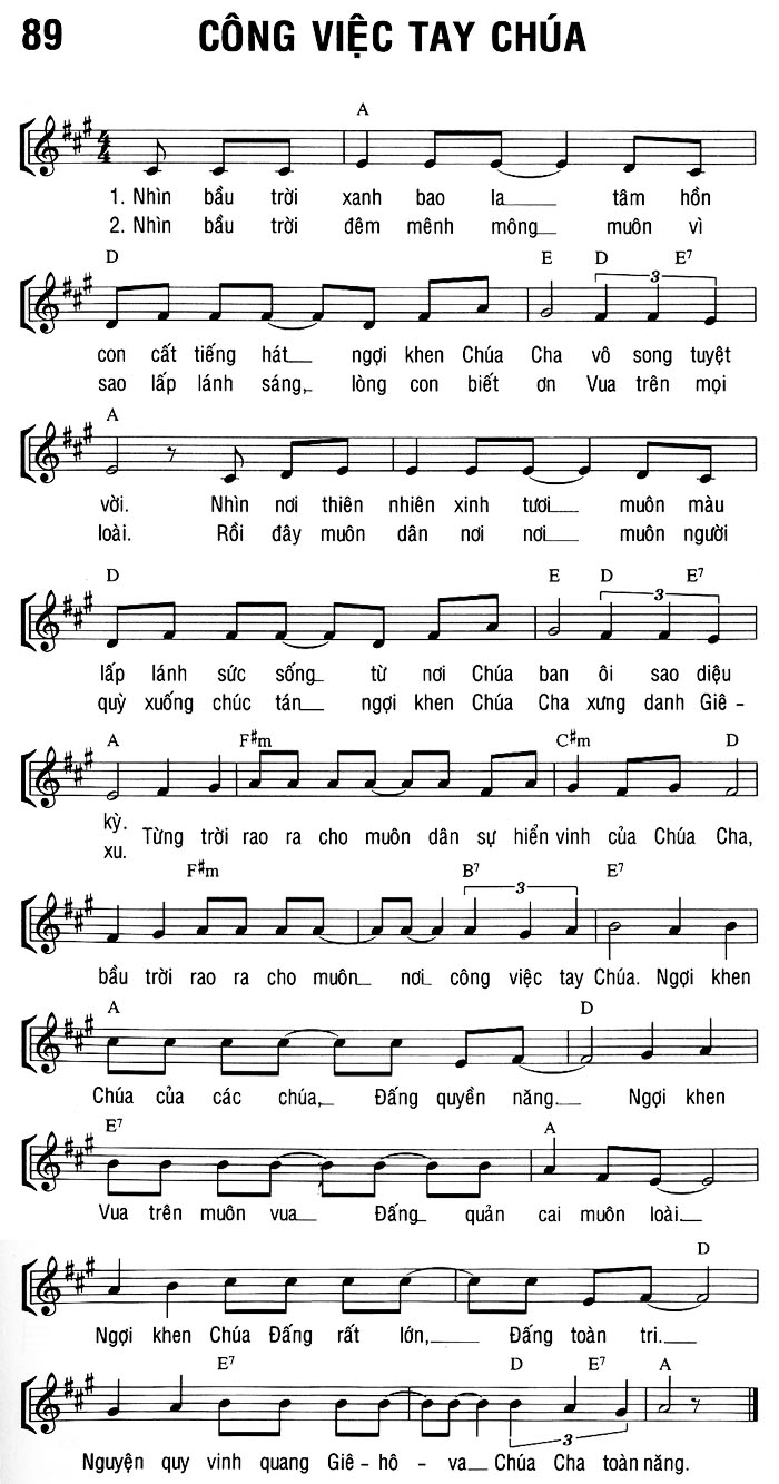1. Nhìn bầu trời xanh bao la tâm hồn con cất tiếng hát ngợi khen Chúa Cha vô song tuyệt vời. Nhìn nơi thiên nhiên xinh tươi muôn màu lấp lánh sức sống từ nơi Chúa ban ôi sao diệu kỳ. Từng trời rao ra cho muôn dân sự hiển vinh của Chúa Cha, Chúa của các chúa, Đấng quyền năng. Vua trên muôn vua Đấng quản cai muôn loài. Ngợi khen Chúa Đấng rất lớn, Đấng toàn tri. Nguyện quy vinh quang Giê-hô-va Chúa Cha toàn năng. 2. Nhìn bầu trời đêm mênh mông muôn vì sao lấp lánh sáng, lòng con biết ơn Vua trên mọi loài. Rồi đây muôn dân nơi nơi muôn người quỳ xuống chúc tán ngợi khen Chúa Cha xưng danh Giê-xu. Bầu trời rao ra cho muôn nơi công việc tay Chúa. Ngợi khen Chúa của các chúa, Đấng quyền năng. Vua trên muôn vua Đấng quản cai muôn loài. Ngợi khen Chúa Đấng rất lớn, Đấng toàn tri. Nguyện quy vinh quang Giê-hô-va Chúa Cha toàn năng. Điệp khúc: Từng trời rao ra cho muôn dân sự hiển vinh của Chúa Cha, Chúa của các chúa, Đấng quyền năng. Vua trên muôn vua Đấng quản cai muôn loài. Ngợi khen Chúa Đấng rất lớn, Đấng toàn tri. Nguyện quy vinh quang Giê-hô-va Chúa Cha toàn năng.