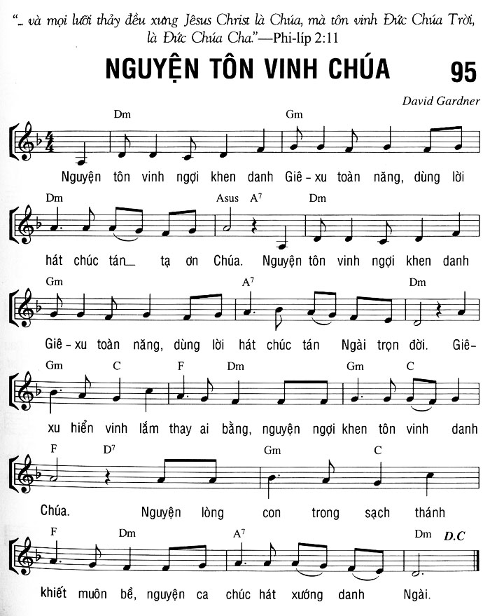 1. Nguyện tôn vinh ngợi khen danh Giê-xu toàn năng, dùng lời hát chúc tán tạ ơn Chúa. Nguyện tôn vinh ngợi khen danh Giê-xu toàn năng, dùng lời hát chúc tán Ngài trọn đời. Giê-xu hiển vinh lắm thay ai bằng, nguyện ngợi khen tôn vinh danh Chúa. Nguyện lòng con trong sạch thánh khiết muôn bề, nguyện ca chúc hát xướng danh Ngài.