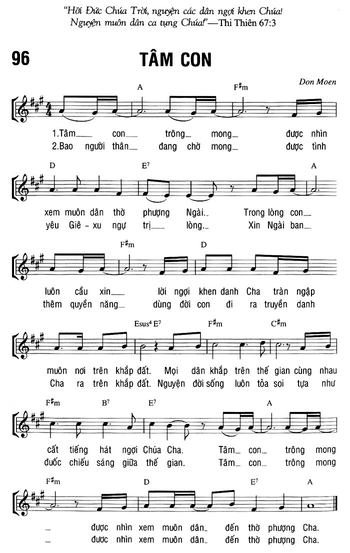 1. Tâm con trông mong được nhìn xem muôn dân thờ phượng Ngài. Trong lòng con luôn cầu xin lời ngợi khen danh Cha tràn ngập muôn nơi trên khắp đất. Mọi dân khắp trên thế gian cùng nhau cất tiếng hát ngợi Chúa Cha. Tâm con trông mong được nhìn xem muôn dân đến thờ phượng Cha. 2. Bao người thân đang chờ mong được tình yêu Giê-xu ngự trị lòng. Xin Ngài ban thêm quyền năng dùng đời con đi ra truyền danh Cha ra trên khắp đất. Nguyện đời sống luôn tỏa soi tựa như đuốc chiếu sáng giữa thế gian. Tâm con trông mong được nhìn xem muôn dân đến thờ phượng Cha.
