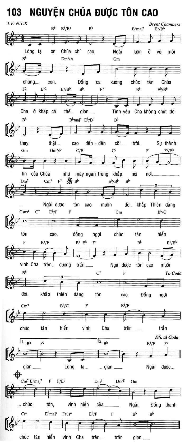 1. Lòng tạ ơn Chúa chí cao, Ngài luôn ở với mỗi chúng con. Đồng ca xướng chúc tán Chúa Cha ở khắp cả thế gian. Tình yêu Cha không chút đổi thay, thật cao đến – đến cõi trời. Sự thành tín của Chúa như mây ngàn trùng khắp nơi nơi. Ngài được tôn cao muôn đời, khắp Thiên đàng tôn cao, đồng ngợi chúc tán hiển vinh Cha trên dương trần. Ngài được tôn cao muôn đời, khắp thiên đàng tôn cao. Đồng ngợi chúc tán hiển vinh Cha trên trần gian. 2. Lòng tạ... gian. Ngài được... chúc tôn, vinh hiển của Ngài. Đồng thanh chúc tán hiển vinh Cha trên trần gian.