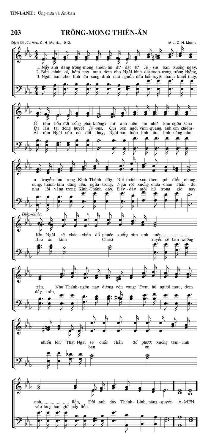 1. Nầy anh đang trông-mong thiên-ân dư - dật từ Jê-sus ban xuống ngay, Ở tâm - hồn đời sống phải không? Thì anh nên tin như kim-ngôn Cha ta truyền lưu trong Kinh-Thánh đây, Noi thánh xưa, theo qui-điều chung. anh liền, Đời anh dẫy Thánh - Linh, năng-quyền. A-MEN. 2. Bần - nhân ơi, hôm nay mau đem cho Ngài bình đất sạch-trong trống không, Đã lau tại dòng huyết Jê-sus, Quì bên ngôi vinh-quang, anh em khiêm- cung, thành-tâm dâng lên, ngửa - trông, Ngài rót xuống chứa - chan Thần - du. vào lòng bạn giờ nầy liền. 3. Ngài ban cho linh-ân sung-dinh như nguồn dầu bất-tuyệt thanh-khiết thay, Ái - tâm Ngài nào có đổi thay, Ngài ban luôn linh ân, linh-năng cho như lời vàng trong Kinh-Thánh đây, Đầy dẫy mỗi hũ trong giờ nay. ban ơn Điệp khúc: Kìa, Ngài sẽ chắc - chắn đổ phước xuống tâm anh tuôn. Bao ơn lành Christ truyền sẽ ban xuống tràn. Như Thánh - ngôn nay đương còn vang: "Đem hũ ngươi mau, đem đầy tràn, nhiều lên". Thật Ngài sẽ chắc chắn đổ phước xuống tâm - linh