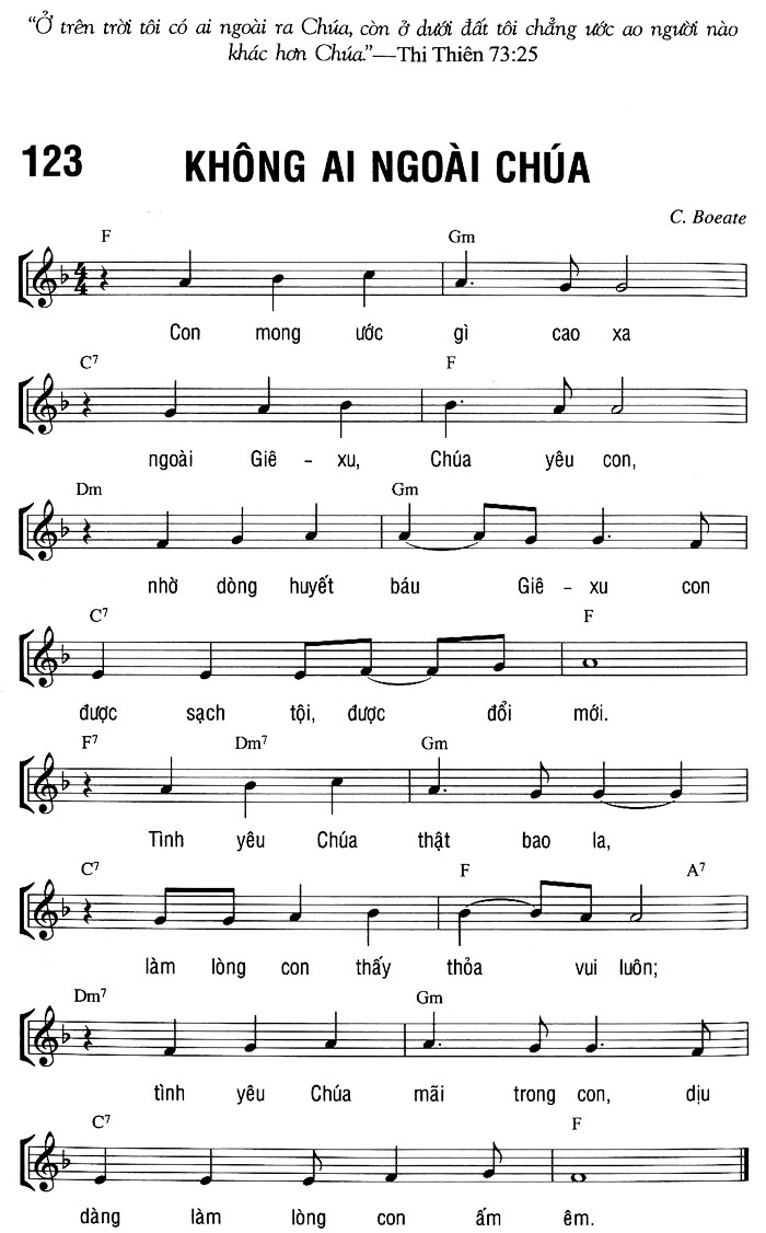 1. Con mong ước gì cao xa ngoài Giê-xu, Chúa yêu con, nhờ dòng huyết báu Giê-xu con được sạch tội, được đổi mới. 2. Tình yêu Chúa thật bao la, làm lòng con thấy thỏa vui luôn; tình yêu Chúa mãi trong con, dịu dàng làm lòng con ấm êm. 3. Nguyện xin Chúa ngự trong con, làm lòng con vững tin không phai; nguyện xin Chúa mãi bên con, dìu dắt con đi đến thiên đàng.