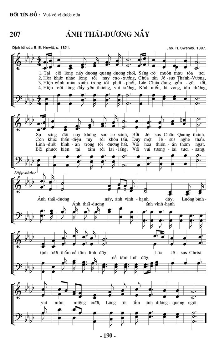 1. Tại cõi lòng nầy dương quang đương chói, Sáng rỡ muôn màu tỏa soi Sự sáng đời nay không sao so sánh, Bởi Jê-sus Chân-Quang thánh. 2. Hòa khúc nhạc lòng tôi nay cao-xướng, Chúa tán Jê-sus Thánh-Vương, Còn khúc thần-diệu tuy tôi khôn tấu, Duy một Jê-sus nghe thấu. 3. Hiện cảnh mùa xuân trong tôi phơi phới, Lúc Chúa đang gần-gũi tôi, Linh điệu bình an trong tôi đương hát, Với hoa thiên-ân thơm ngát. 4. Hiện cõi lòng đầy yêu-thương, vui sướng, Kính mến, hi vọng, tán-dương, Bởi phước hiện tại tâm tôi lai láng, Với vui tương lai tươi sáng. Điệp khúc: Ánh thái-dương nầy, ánh vinh-hạnh đầy. Ánh thái-dương ánh vinh-hạnh Luồng bình-tịnh tươi-thắm cả tâm-linh đây, cả tâm linh đây, Lúc Jê-sus Christ vui mỉm miệng cười, Lòng tôi tắm ánh dương-quang ngời.