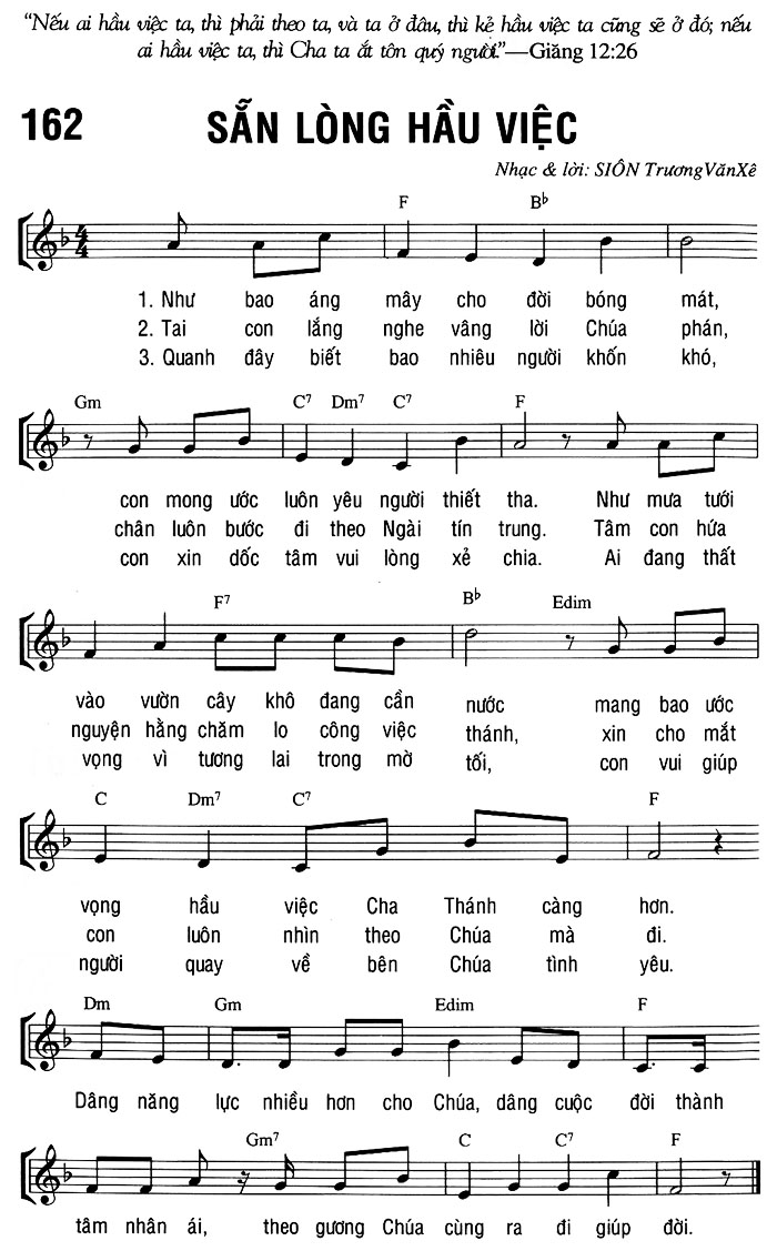 1. Như bao áng mây cho đời bóng mát, con mong ước luôn yêu người thiết tha. vào vườn cây khô đang cần nước mang bao ước vọng hầu việc Cha Thánh càng hơn. 2. Tai con lắng nghe vâng lời Chúa phán, chân luôn bước đi theo Ngài tín trung. nguyện hằng chăm lo công việc thánh, xin cho mắt con luôn nhìn theo Chúa mà đi. 3. Quanh đây biết bao nhiêu người khốn khó, con xin dốc tâm vui lòng xẻ chia. vọng vì tương lai trong mờ tối, con vui giúp người quay về bên Chúa tình yêu. Điệp khúc: Dâng năng lực nhiều hơn cho Chúa, dâng cuộc đời thành tâm nhân ái, theo gương Chúa cùng ra đi giúp đời.