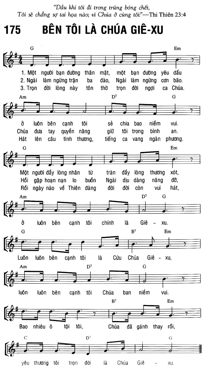 1. Một người bạn đường thân mật, một bạn đường yêu dấu Ở luôn bên cạnh tôi sẽ chia bao niềm vui. Một người đầy lòng nhân từ tràn đầy lòng thương xót, Ở luôn bên cạnh tôi chính là Giê-xu. Luôn luôn bên cạnh tôi là Cứu Chúa Giê-xu, luôn luôn bên cạnh tôi Chúa ban niềm vui. Bao nhiêu ô tội tôi, Chúa đã gánh thay rồi, yêu thương tôi trọn đời là Chúa Giê-xu. 2. Ngài làm ngừng trận ba đào, Ngài làm ngừng cơn bão. Chúa đưa tay quyền năng giữ tôi trong bình an. Hồi gặp hoạn nạn lo buồn Ngài dịu dàng nâng đỡ, Ở luôn bên cạnh tôi chính là Giê-xu. Luôn luôn bên cạnh tôi là Cứu Chúa Giê-xu, luôn luôn bên cạnh tôi Chúa ban niềm vui. Bao nhiêu ô tội tôi, Chúa đã gánh thay rồi, yêu thương tôi trọn đời là Chúa Giê-xu. 3. Trọn đời lòng này tôn thờ trọn đời ngợi ca Chúa. Hát lên câu tình thương, tiếng ca vang ngàn phương. Rồi ngày nào về Thiên đàng đời đời còn vui hát, Ở luôn bên cạnh tôi chính là Giê-xu. Luôn luôn bên cạnh tôi là Cứu Chúa Giê-xu, luôn luôn bên cạnh tôi Chúa ban niềm vui. Bao nhiêu ô tội tôi, Chúa đã gánh thay rồi, yêu thương tôi trọn đời là Chúa Giê-xu.
