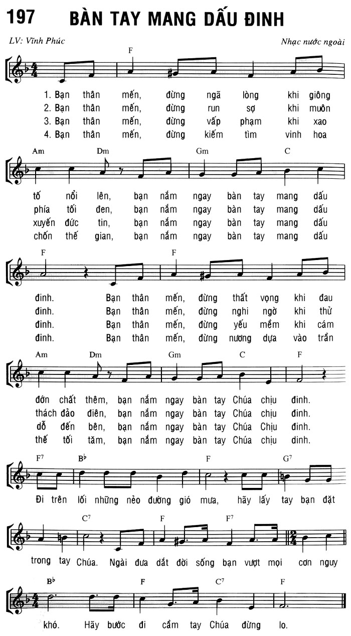 1. Bạn thân mến, đừng ngã lòng khi giông tố nổi lên, bạn nắm ngay bàn tay mang dấu đinh. Bạn thân mến, đừng thất vọng khi đau đớn chất thêm, bạn nắm ngay bàn tay Chúa chịu đinh. 2. Bạn thân mến, đừng run sợ khi muôn phía tối đen, bạn nắm ngay bàn tay mang dấu đinh. Bạn thân mến, đừng nghi ngờ khi thử thách đảo điên, bạn nắm ngay bàn tay Chúa chịu đinh. 3. Bạn thân mến, đừng vấp phạm khi xao xuyến đức tin, bạn nắm ngay bàn tay mang dấu đinh. Bạn thân mến, đừng yếu mềm khi cám dỗ đến bền, bạn nắm ngay bàn tay Chúa chịu đinh. 4. Bạn thân mến, đừng kiếm tìm vinh hoa chốn thế gian, bạn nắm ngay bàn tay mang dấu đinh. Bạn thân mến, đừng nương dựa vào trần thế tối tăm, bạn nắm ngay bàn tay Chúa chịu đinh. Điệp khúc: Đi trên lối những nẻo đường gió mưa, hãy lấy tay bạn đặt trong tay Chúa. Ngài đưa dắt đời sống bạn vượt mọi cơn nguy khó. Hãy bước đi cầm tay Chúa đừng lo.