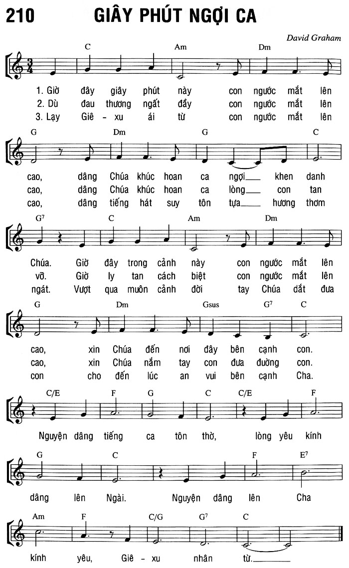 1. Giờ đây giây phút này con ngước mắt lên cao, dâng Chúa khúc hoan ca ngợi khen danh Chúa. Giờ đây trong cảnh này con ngước mắt lên cao, xin Chúa đến nơi đây bên cạnh con. 2. Dù đau thương ngất đầy con ngước mắt lên cao, dâng Chúa khúc hoan ca lòng con tan võ. Giờ ly tan cách biệt con ngước mắt lên cao, xin Chúa nắm tay con đưa đường con. 3. Lạy Giê-xu ái từ con ngước mắt lên cao, dâng tiếng hát suy tôn tựa hương thơm ngát. Vượt qua muôn cảnh đời tay Chúa dắt đưa con cho đến lúc an vui bên cạnh Cha. chorus. Nguyện dâng tiếng ca tôn thờ, lòng yêu kính dâng lên Ngài. Nguyện dâng lên Cha kính yêu, Giê-xu nhân từ. Điệp khúc: Nguyện dâng tiếng ca tôn thờ, lòng yêu kính dâng lên Ngài. Nguyện dâng lên Cha kính yêu, Giê-xu nhân từ.
