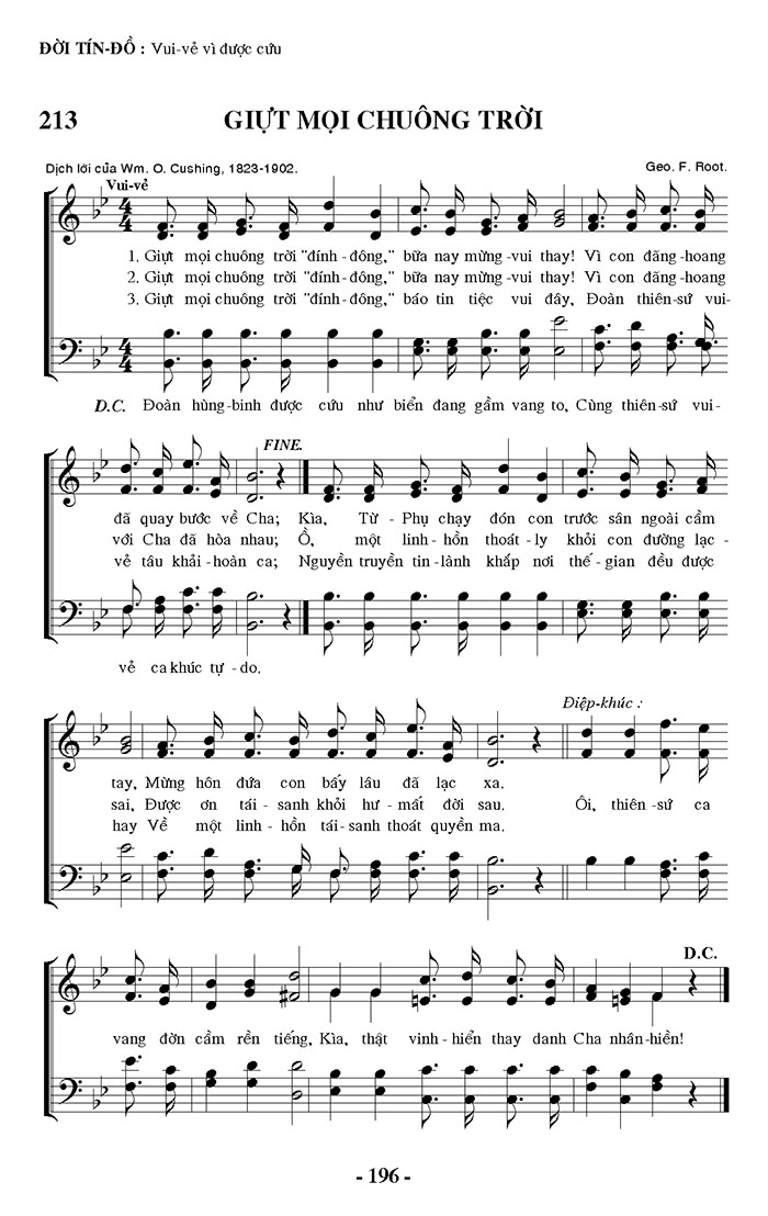 1. Giựt mọi chuông trời "đính-đông," bữa nay mừng-vui thay! Vì con đăng-hoang đã quay bước về Cha; Kìa, Từ-Phụ chạy đón con trước sân ngoài cầm tay, Mừng hôn đứa con bấy lâu đã lạc xa. 2. Giựt mọi chuông trời "đính-đông," bữa nay mừng-vui thay! Vì con đăng-hoang với Cha đã hòa nhau; Ồ, một linh-hồn thoát-ly khỏi con đường lạc sai, Được ơn tái-sanh khỏi hư-mất đời sau. 3. Giựt mọi chuông trời "đính-đông," báo tin tiệc vui đây, Đoàn thiên-sứ vui-vẻ tâu khải-hoàn ca; Nguyện truyền tin-lành khắp nơi thế-gian đều được hay Về một linh-hồn tái-sanh thoát quyền ma. D.C.. Đoàn hùng-binh được cứu như biển đang gầm vang to, Cùng thiên sứ vui-vẻ ca khúc tự-do. Điệp khúc: Ôi, thiên-sứ ca vang đờn cầm rền tiếng, Kìa, thật vinh-hiển thay danh Cha nhân hiền!