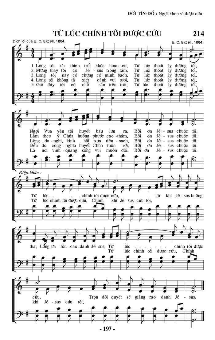 1. Lòng tôi ưa thích trổi khúc hoan ca, Từ lúc thoát ly đường tối, Ngợi Vua yêu tôi huyết báu lưu ra, Bởi ơn Jê-sus chuộc tôi. 2. Mừng thay tôi có Jê-sus trong tâm, Từ lúc thoát ly đường tối, Làm theo ý Chúa hưởng phước cao thâm, Bởi ơn Jê-sus chuộc tôi. 3. Lòng tôi nay có chứng cơ minh bạch, Từ lúc thoát ly đường tối, Lòng đa nghi, kinh hãi xưa tiêu sạch, Bởi ơn Jê-sus chuộc tôi. 4. Lòng tôi không tả xiết cảnh vui tươi, Từ lúc thoát ly đường tối, Đều do công-nghĩa huyết Chúa tuôn rơi, Bởi ơn Jê-sus chuộc tôi. 5. Giờ đây tôi có chỗ sẵn trên trời, Từ lúc thoát ly đường tối, Là nơi vinh-quang sống vui muôn đời, Bởi ơn Jê-sus chuộc tôi. Điệp khúc: Từ lúc chính tôi được cứu, Từ khi Jê-sus buông tha, Lòng ưa tôn cao danh Jê-sus; Từ lúc chính tôi được cứu, Chính khi Jê-sus cứu tôi, Trọn đời quyết sẽ giảng rao danh Jê-sus.