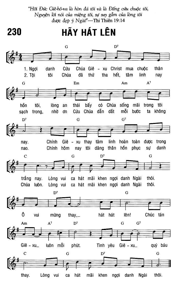 1. Ngợi danh Cứu Chúa Giê-xu Christ mua chuộc thân hồn tôi, lòng an thái bấy có Chúa sống mãi trong tôi nay. Chính Giê-xu thay tâm linh hoàn toàn được trong trắng nay. Lòng vui ca hát mãi khen ngợi danh Ngài thôi. 2. Tội tôi Chúa đã thứ tha hết, tâm linh nay sạch trong, nhờ ơn Cứu Chúa dẫn dắt mỗi bước ta không nao. Chính hôm nay tôi dâng thân hồn phục sự danh Chúa luôn. Lòng vui ca hát mãi khen ngợi danh Ngài thôi. Điệp khúc: Ô vui mừng thay, hát hát lên! Chúc tán Giê-xu luôn mỗi phút. Tình yêu Giê-xu quý báu thay. Lòng vui ca hát mãi khen ngợi danh Ngài thôi.