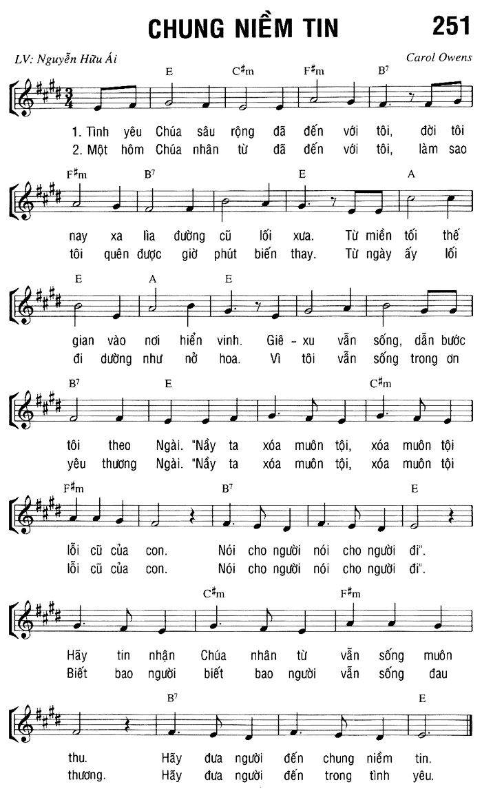 1. Tình yêu Chúa sâu rộng đã đến với tôi, đời tôi nay xa lìa đường cũ lối xưa. Từ miền tối thế gian vào nơi hiển vinh. Giê-xu vẫn sống, dẫn bước tôi theo Ngài. "Nầy ta xóa muôn tội, xóa muôn tội lỗi cũ của con. Nói cho người nói cho người đi". Hãy tin nhận Chúa nhân từ vẫn sống muôn thu. Hãy đưa người đến chung niềm tin. 2. Một hôm Chúa nhân từ đã đến với tôi, làm sao tôi quên được giờ phút biến thay. Từ ngày ấy lối đi dường như nở hoa. Vì tôi vẫn sống trong ơn yêu thương Ngài. "Nầy ta xóa muôn tội, xóa muôn tội lỗi cũ của con. Nói cho người nói cho người đi". Biết bao người biết bao người vẫn sống đau thương. Hãy đưa người đến trong tình yêu.