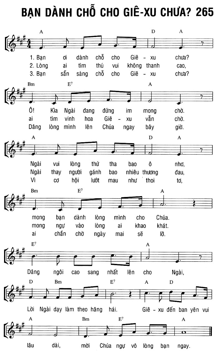 1. Bạn ơi dành chỗ cho Giê-xu chưa? Ô! Kìa Ngài đang đứng im mong chờ. Ngài vui lòng thứ tha bao ô nhơ, mong bạn dành lòng mình cho Chúa. Dâng ngôi cao sang nhất lên cho Ngài, Lời Ngài dạy làm theo hăng hái. lâu dài, mời Chúa ngự vô lòng bạn ngay. 2. Lòng ai tìm thú vui không thanh cao, ai tìm vinh hoa Giê-xu vẫn chờ. Ngài thay người gánh bao nhiêu thương đau, mong ngự vào lòng ai khao khát. Dâng ngôi cao sang nhất lên cho Ngài, Lời Ngài dạy làm theo hăng hái. lâu dài, mời Chúa ngự vô lòng bạn ngay. 3. Bạn sẵn sàng chỗ cho Giê-xu chưa? Dâng lòng mình lên Chúa ngay bây giờ. Vì cơ hội lướt mau như thoi tơ, ai chần chờ ngày mai sẽ lỡ. Dâng ngôi cao sang nhất lên cho Ngài, Lời Ngài dạy làm theo hăng hái. Giê-xu đến ban yên vui lâu dài, mời Chúa ngự vô lòng bạn ngay.