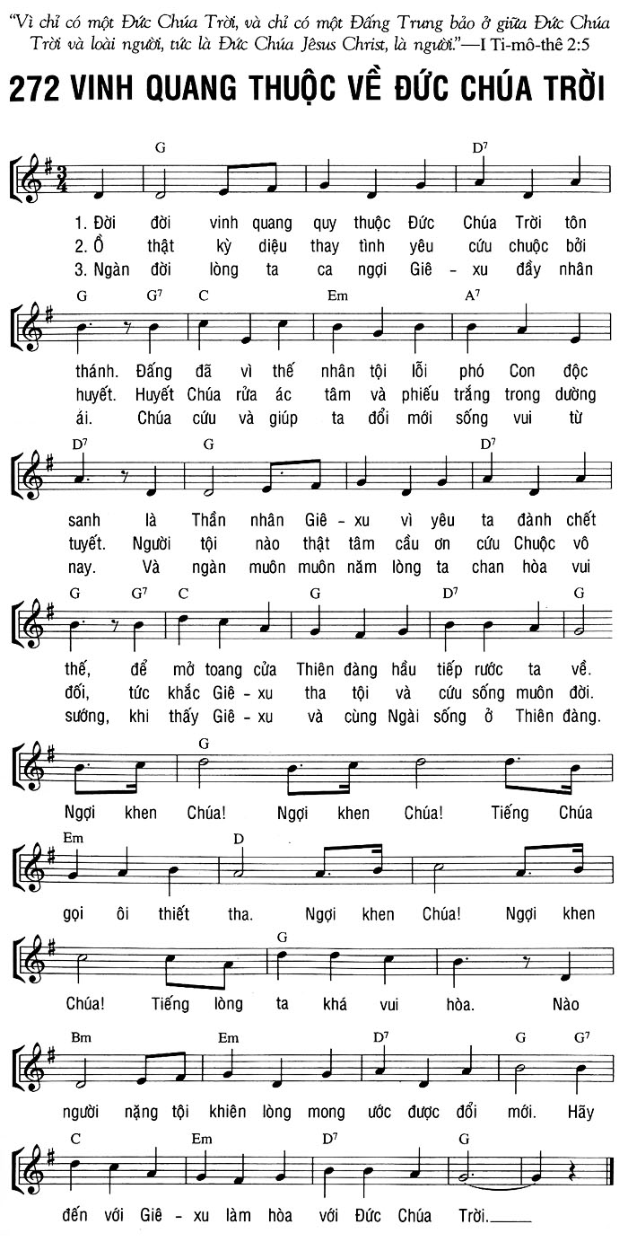 1. Đời đời vinh quang quy thuộc Đức Chúa Trời tôn thánh. Đấng đã vì thế nhân tội lỗi phó Con độc sanh là Thần nhân Giê-xu vì yêu ta đành chết thế, để mở toang cửa Thiên đàng hầu tiếp rước ta về. Ngợi khen Chúa! Ngợi khen Chúa! Tiếng Chúa gọi ôi thiết tha. Ngợi khen Chúa! Tiếng lòng ta khá vui hòa. Nào người nặng tội khiên lòng mong ước được đổi mới. Hãy đến với Giê-xu làm hòa với Đức Chúa Trời. 2. Ô thật kỳ diệu thay tình yêu cứu chuộc bởi huyết. Huyết Chúa rửa ác tâm và phiếu trắng trong đường dưỡng tuyết. Người tội nào thật tâm cầu ơn cứu Chuộc vô đối, tức khắc Giê-xu tha tội và cứu sống muôn đời. Ngợi khen Chúa! Ngợi khen Chúa! Tiếng Chúa gọi ôi thiết tha. Ngợi khen Chúa! Tiếng lòng ta khá vui hòa. Nào người nặng tội khiên lòng mong ước được đổi mới. Hãy đến với Giê-xu làm hòa với Đức Chúa Trời. 3. Ngàn đời lòng ta ca ngợi Giê-xu đầy nhân ái. Chúa cứu và giúp ta đổi mới sống vui từ nay. Và ngàn muôn muôn năm lòng ta chan hòa vui sướng, khi thấy Giê-xu và cùng Ngài sống ở Thiên đàng. Ngợi khen Chúa! Ngợi khen Chúa! Tiếng Chúa gọi ôi thiết tha. Ngợi khen Chúa! Tiếng lòng ta khá vui hòa. Nào người nặng tội khiên lòng mong ước được đổi mới. Hãy đến với Giê-xu làm hòa với Đức Chúa Trời.
