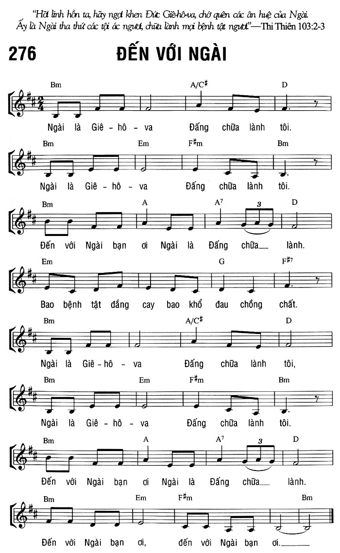 Điệp khúc: Ngài là Giê-hô-va Đấng chữa lành tôi. Ngài là Giê-hô-va Đấng chữa lành tôi. Đến với Ngài bạn ơi Ngài là Đấng chữa lành. Bao bệnh tật đắng cay bao khổ đau chồng chất. Ngài là Giê-hô-va Đấng chữa lành tôi, Ngài là Giê-hô-va Đấng chữa lành tôi. Đến với Ngài bạn ơi Ngài là Đấng chữa lành. Đến với Ngài bạn ơi, đến với Ngài bạn ơi.