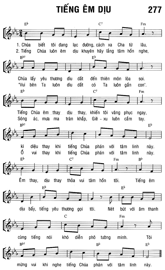 1. Chúa biết tôi đang lạc đường, cách xa Cha từ lâu, Chúa lấy yêu thương dìu dắt đến thiên môn lòa soi. Tiếng Chúa êm thay dịu thay, khiến tôi vâng phục ngay, kì diệu thay khi tiếng Chúa phán với tâm linh này. 2. Tiếng Chúa luôn êm dịu khuyên hãy lắng tâm hồn nghe, "Vui bên Ta luôn dìu dắt có Ta luôn gần con". Sóng ác, mưa ma tràn khắp, Giê-xu luôn cầm tay. Ô vui thay khi tiếng Chúa phán với tâm linh này. Điệp khúc: Êm thay, dịu thay thỏa vui tâm hồn tôi. Tiếng êm dịu bấy, tiếng yêu thương gọi tôi. Nét bút với âm thanh cùng tiếng nói khó diễn phô tường minh. Tôi mừng vui khi nghe tiếng Chúa phán với tâm linh này.