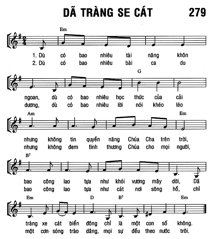1. Dù có bao nhiêu tài năng khôn ngoan, dù có bao nhiêu học thức của cải nhưng không tin quyền năng Chúa Cha trên trời, bao công lao tựa như khói vương mây đời, Dã tràng xe cát biển đông chỉ là một con số không. 2. Dù có bao nhiêu bài ca du dương, dù có bao nhiêu lời nói khéo léo nhưng không đem tình thương Chúa cho mọi người, bao công lao tựa như cát nơi sông hồ, chỉ một cơn sóng trào dâng, mọi sự đều theo nước trôi.