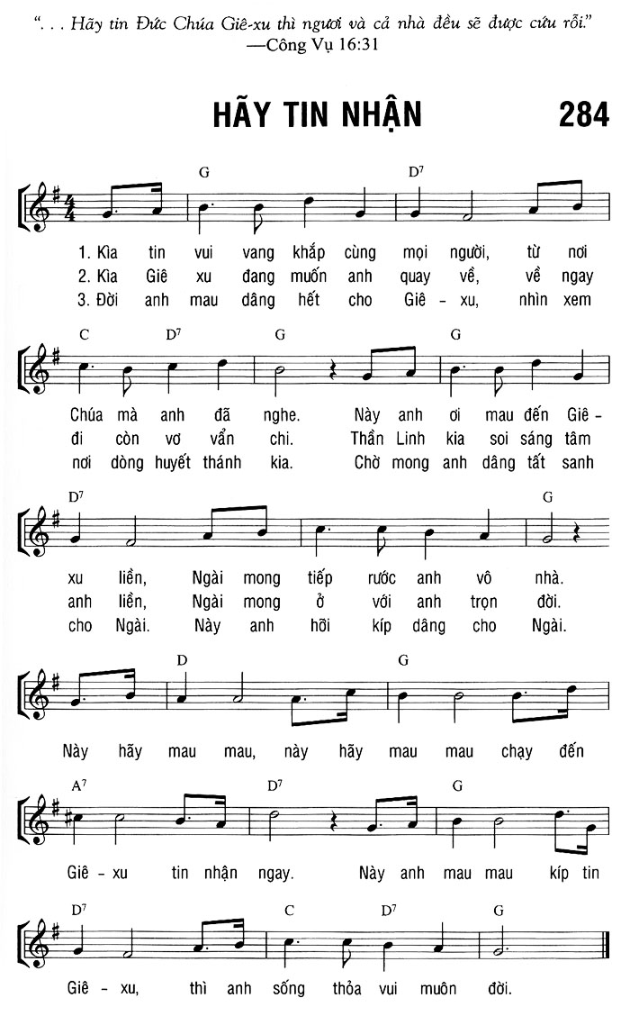 1. Kia tin vui vang khắp cùng mọi người, từ nơi Chúa mà anh đã nghe. Này anh ơi mau đến Giê-xu liền, Ngài mong tiếp rước anh vô nhà. Này hãy mau mau, này hãy mau mau chạy đến Giê-xu tin nhận ngay. Giê-xu, thì anh sống thỏa vui muôn đời. 2. Kia Giê-xu đang muốn anh quay về, về ngay đi còn vơ vấn chi. Thần Linh kia soi sáng tâm anh liền, Ngài mong ở với anh trọn đời. Này hãy mau mau, này hãy mau mau chạy đến Giê-xu tin nhận ngay. Giê-xu, thì anh sống thỏa vui muôn đời. 3. Đời anh mau dâng hết cho Giê-xu, nhìn xem nơi dòng huyết thánh kia. Chờ mong anh dâng tất sanh cho Ngài. Này anh hỡi kíp dâng cho Ngài. Này hãy mau mau, này hãy mau mau chạy đến Giê-xu tin nhận ngay. Giê-xu, thì anh sống thỏa vui muôn đời. Điệp khúc: Này anh mau mau kíp tin