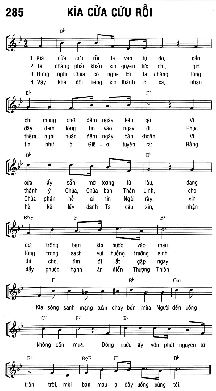 1. Kìa cửa cứu rỗi ta vào tự do, cần chi mong chờ đêm ngày kêu gõ. Vì cửa ấy sẵn mở toang từ lâu, đang đợi trông bạn kíp bước vào mau. 2. Ta chẳng phải khẩn xin quyền lực chi, giờ đây đem lòng tin vào ngay đi. Phục thánh ý Chúa, Chúa ban Thần Linh, cho lòng trong sạch vui hưởng trường sinh. 3. Đừng nghĩ Chúa có nghe lời ta chăng, thêm nghi hoặc đêm ngày băn khoăn. Vì Chúa phán hễ ai tin Ngài rày, xin thì cho, tìm di ắt gặp ngay. 4. Vậy khá đổi tiếng xin thành lời ca, tin như lời Giê-xu tuyên ra: Rằng hễ kẻ lấy danh Ta cầu xin, nhận đầy phước hạnh ân điển Thượng Thiên. Điệp khúc: Kia sông sanh mạng tuôn chảy bốn mùa. Người đến uống không cần mua. Dòng nước ấy vốn phát nguyên từ trên trời, mời bạn mau lại đây uống cùng tôi.
