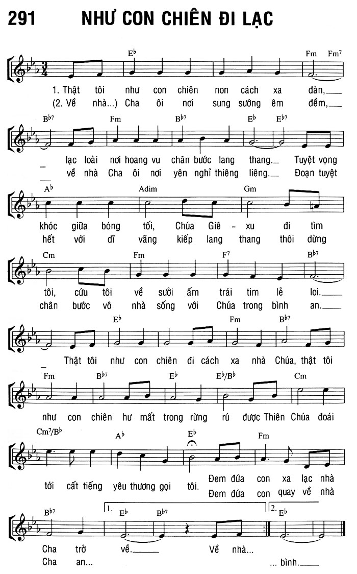1. Thật tôi như con chiên non cách xa đàn, lạc loài nơi hoang vu chân bước lang thang. Tuyệt vọng khóc giữa bóng tối, Chúa Giê-xu đi tìm tôi, cứu tôi về sưởi ấm trái tim lẻ loi. Thật tôi như con chiên đi cách xa nhà Chúa, thật tôi như con chiên hư mất trong rừng rú được Thiên Chúa đoái tới cất tiếng yêu thương gọi tôi. Đem đứa con xa lạc nhà Cha trở về. 2. Về nhà... Cha ôi nơi sung sướng êm đềm, về nhà Cha ôi nơi yên nghỉ thiêng liêng. Đoạn tuyệt hết với di vãng kiếp lang thang thôi dừng chân bước vô nhà sống với Chúa trong bình an. Thật tôi như con chiên đi cách xa nhà Chúa, thật tôi như con chiên hư mất trong rừng rú được Thiên Chúa đoái tới cất tiếng yêu thương gọi tôi. Đem đứa con quay về nhà Cha an... Về nhà... bình.