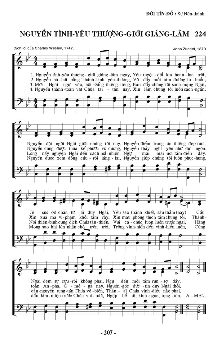 1. Nguyền tình yêu thượng - giới giáng lâm ngay, Yêu tuyệt đối kia hoan - lạc trời; Nguyền đặt ngôi Ngài giữa chúng tôi nay, Nguyền điểm - trang ơn thiêng đẹp tươi. Jê - sus ôi! chân - từ ái duy Ngài, Yêu sao thánh khiết, sâu-thẳm thay! Ngài đem sự cứu-rỗi không phai, Ngự đến mỗi tâm run sợ đây. 2. Nguyền hà - hơi bằng Thánh Linh yêu thương, Vô đầy mỗi tâm đương lo - buồn; Nguyền cùng được thừa - kế phước vô cương, Nguyền thảy nghỉ yên như dự - ngôn. Xin xua ma vi-phạm khỏi tâm rày, Xin mau phóng thích tâm chúng tôi, Cầu Thành - toàn An pha, Ô - mê - ga nay, Nguồn gốc đức - tin duy Ngài thôi. 3. Mời Ngài ngự vào, hỡi Đấng thiêng-liêng, Ban đầy chúng tôi sanh-mạng Ngài; Lòng nầy nguyện Ngài đến cách hốt-nhiên, Ngự mãi mãi nơi tâm-điển đây. Nơi thiên-binh cung dịch Chúa tận-thiền, Vui ca - chúc luôn luôn trước ngai, Hằng Cùng cầu nguyện tụng -tán Chúa vô - biên, Thần - ái Chúa vinh diệu nào phai. 4. Nguyền thành - toàn vật Chúa tái - tân nay, Xin làm chúng tôi luôn sạch - ngần; Nguyền được xem dòng cứu - rỗi láng - lai, Nguyền giúp chúng tôi luôn phục-hưng. Mong sao khi lên nhận chỗ trên trời, Trong vinh-hiển đến vinh hiển luôn, dầu kim - miện trước Chúa vui - tươi, Ngập bể ái, kinh -ngạc, tụng -tôn. A - MEN.