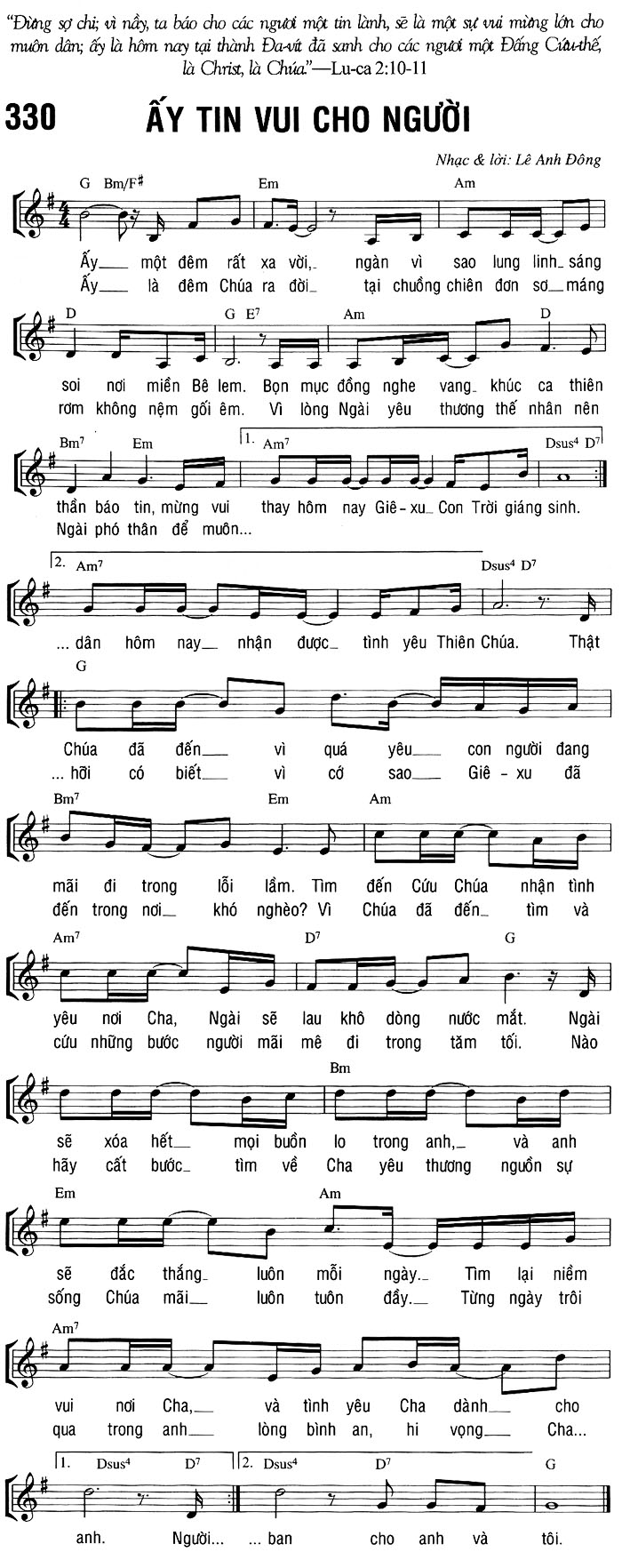 1. Ấy một đêm rất xa vời, ngàn vì sao lung linh sáng soi nơi miền Bê lem. Bọn mục đồng nghe vang khúc ca thiên thần báo tin, mừng vui thay hôm nay Giê-xu Con Trời giáng sinh. Chúa đã đến vì quá yêu con người đang mãi đi trong lỗi lầm. Tìm đến Cứu Chúa nhận tình yêu nơi Cha, Ngài sẽ lau khô dòng nước mắt. Ngài sẽ xóa hết mọi buồn lo trong anh, và anh sẽ đắc thắng luôn mỗi ngày. Tìm lại niềm vui nơi Cha, và tình yêu Cha dành cho anh. 2. Ấy là đêm Chúa ra đời tại chuồng chiên đơn sơ máng rơm không nệm gối êm. Vì lòng Ngài yêu thương thế nhân nên Ngài phó thân để muôn dân hôm nay nhận được tình yêu Thiên Chúa. Thật hỡi có biết vì cớ sao Giê-xu đã đến trong nơi khó nghèo? Vì Chúa đã đến tìm và cứu những bước người mãi mê đi trong tăm tối. Nào hãy cất bước tìm về Cha yêu thương nguồn sự sống Chúa mãi luôn tuôn đầy. Từng ngày trôi qua trong anh lòng bình an, hi vọng Cha... Người... ban cho anh và tôi.