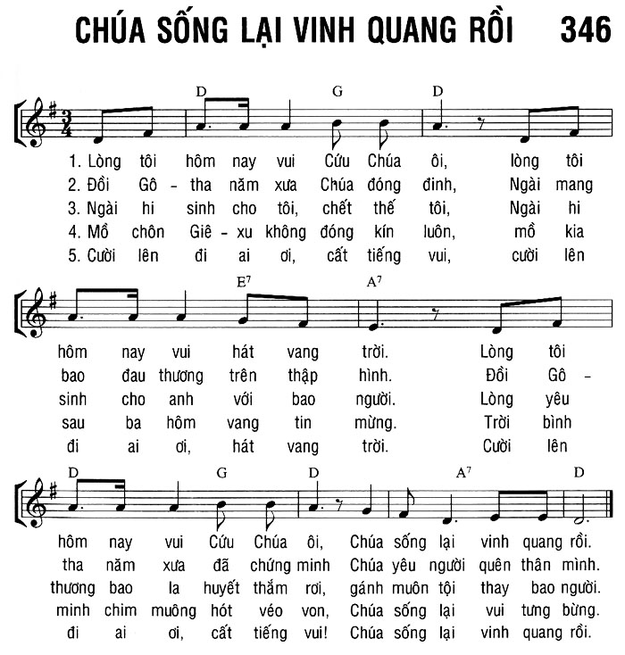 1. Lòng tôi hôm nay vui Cứu Chúa ôi, lòng tôi hôm nay vui hát vang trời. Lòng tôi hôm nay vui Cứu Chúa ôi, Chúa sống lại vinh quang rồi. 2. Đồi Gô-tha năm xưa Chúa đóng đinh, Ngài mang bao đau thương trên thập hình. Đồi Gô-tha năm xưa đã chứng minh Chúa yêu người quên thân mình. 3. Ngài hi sinh cho tôi, chết thế tôi, Ngài hi sinh cho anh với bao người. Lòng yêu thương bao la huyết thắm rơi, gánh muôn tội thay bao người. 4. Mồ chôn Giê-xu không đóng kín luôn, mồ kia sau ba hôm vang tin mừng. Trời bình minh chim muông hót véo von, Chúa sống lại vui tưng bừng. 5. Cười lên đi ai ơi, cất tiếng vui, cười lên đi ai ơi, hát vang trời. Cười lên đi ai ơi, cất tiếng vui! Chúa sống lại vinh quang rồi.