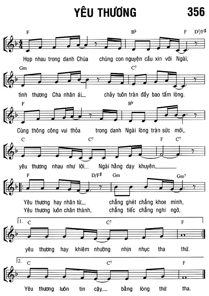 1. Họp nhau trong danh Chúa chúng con nguyện cầu xin với Ngài, tình thương Cha nhân ái chảy tuôn tràn đầy bao tấm lòng. Cùng thông công vui thỏa trong danh Ngài lòng tràn sức mới, yêu thương nhau như lời Ngài hằng dạy khuyên. Yêu thương hay nhân từ, chẳng ghét chẳng khoe mình, yêu thương hay khiêm nhường nhịn nhục tha thứ. 2. Họp nhau trong danh Chúa chúng con nguyện cầu xin với Ngài, tình thương Cha nhân ái chảy tuôn tràn đầy bao tấm lòng. Cùng thông công vui thỏa trong danh Ngài lòng tràn sức mới, yêu thương nhau như lời Ngài hằng dạy khuyên. Yêu thương luôn chân thành, chẳng tiếc chẳng nghi ngờ, Yêu thương luôn tin cậy bằng lòng thứ tha.