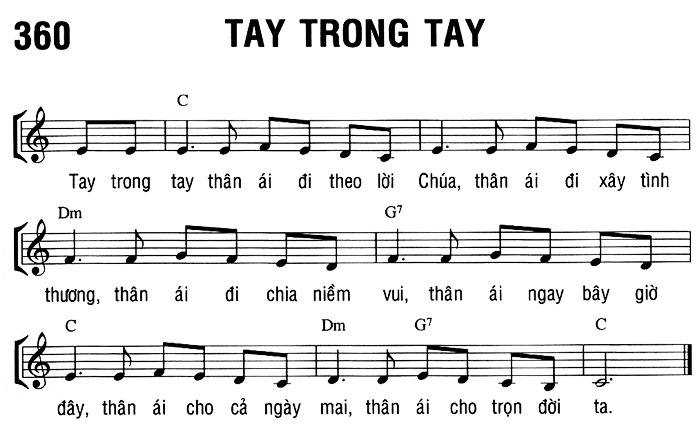 1. Tay trong tay thân ái đi theo lời Chúa, thân ái đi xây tình thương, thân ái đi chia niềm vui, thân ái ngay bây giờ đây, thân ái cho cả ngày mai, thân ái cho trọn đời ta.