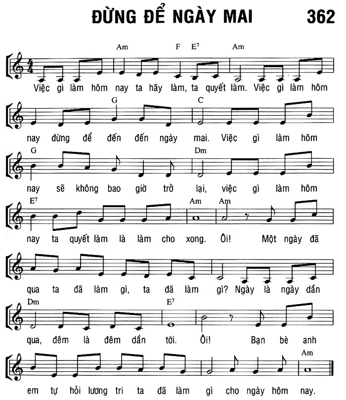 1. Việc gì làm hôm nay ta hãy làm, ta quyết làm. Việc gì làm hôm nay đừng để đến đến ngày mai. Việc gì làm hôm nay sẽ không bao giờ trở lại, việc gì làm hôm nay ta quyết làm là làm cho xong. Ôi! Một ngày đã qua ta đã làm gì, ta đã làm gì? Ngày là ngày dần qua, đêm là đêm dần tới. Ôi! Bạn bè anh em tự hỏi lương tri ta đã làm gì cho ngày hôm nay.