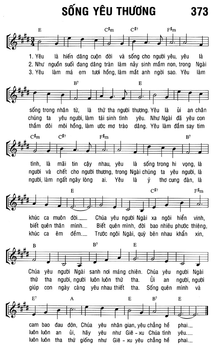 1. Yêu là hiến dâng cuộn đời và sống cho người yêu, yêu là sống trong nhân từ, là thứ tha người thương. Yêu là ủi an chân tình, là mãi tin cậy nhau, yêu là sống trong hi vọng, là khúc ca muôn đời. Chúa yêu người Ngài xa ngôi hiển vinh, sanh nơi máng chiên. Chúa yêu người Ngài cam bao đau đớn, Chúa yêu nhân gian, yêu chẳng hề phai. 2. Như nguồn suối đang dâng tràn làm nảy sinh mầm non, trong Ngài chúng ta yêu người, làm tái sinh tình yêu. Như Ngài đã yêu con người và chết cho người thương, trong Ngài chúng ta yêu người, là biết quên thân mình. Biết quên mình, đời bao nhiêu phước thiêng, thứ tha người, người luôn luôn thứ tha. Ủi an người, người luôn luôn an ủi, hãy yêu như Giê-xu Chúa tình yêu. 3. Yêu làm má em tươi hồng, làm mắt anh ngời sao. Yêu làm thắm đôi môi hồng, làm ước mơ trào dâng. Yêu làm đắm say tim người, làm ngất ngây lòng ai. Yêu là ý thơ cung đàn, là khúc ca êm đềm. Trước ngôi Ngài, quỳ bên nhau khẩn xin, giúp con ngày càng yêu nhau thiết tha. Sống quên mình và luôn luôn tha thứ giống như Giê-xu yêu chẳng hề phai.