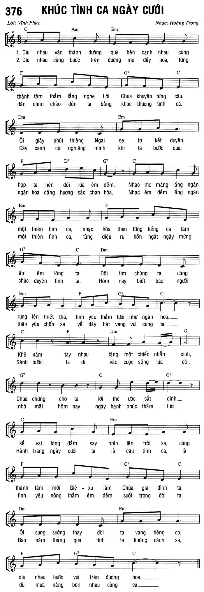 1. Dìu nhau vào thánh đường quỳ bên cạnh nhau, cùng thành tâm thầm lắng nghe Lời Chúa khuyên từng câu. Ôi giây phút thiêng Ngài se tơ kết duyên, hợp ta nên đôi lứa êm đềm. Nhạc mơ màng lắng ngân một thiên tình ca, nhạc hòa theo từng tiếng ca làm ấm êm lòng ta. Đôi tim chúng ta cùng rung lên thiết tha, tình yêu thắm tươi như ngàn hoa. Khẽ nắm tay nhau tặng một chiếc nhẫn xinh, Chúa chứng cho ta lời thề ước sắt đinh. kề vai lòng đắm say nhìn lên trời xa, cùng thành tâm mời Giê-xu làm Chúa gia đình ta. Ôi sung sướng thay đời ta vang tiếng ca, dìu nhau bước vui trên đường hoa. 2. Dìu nhau cùng bước trên đường mơ đầy hoa, từng đàn chim chào đón ta bằng khúc thương tình ca. Cây xanh cúi nghiêng mình khi ta bước qua, ngàn hoa dâng hương sắc chan hòa. Nhạc êm đềm lắng ngân một thiên tình ca, từng điệu ru hồn ngất ngây mừng chúc duyên tình ta. Hôm nay biết bao người thân yêu chốn xa về đây hát vang vui cùng ta. Sánh bước ta đi vào cuộc sống lứa đôi, nhớ mãi hôm nay ngày hạnh phúc thắm tươi. Hành trang ngày cưới ta là câu tình ca, là tình yêu nồng thắm êm đềm suốt trong đời ta. Bao năm tháng qua tình ta không cách xa, dù mưa nắng bên nhau cùng ca.
