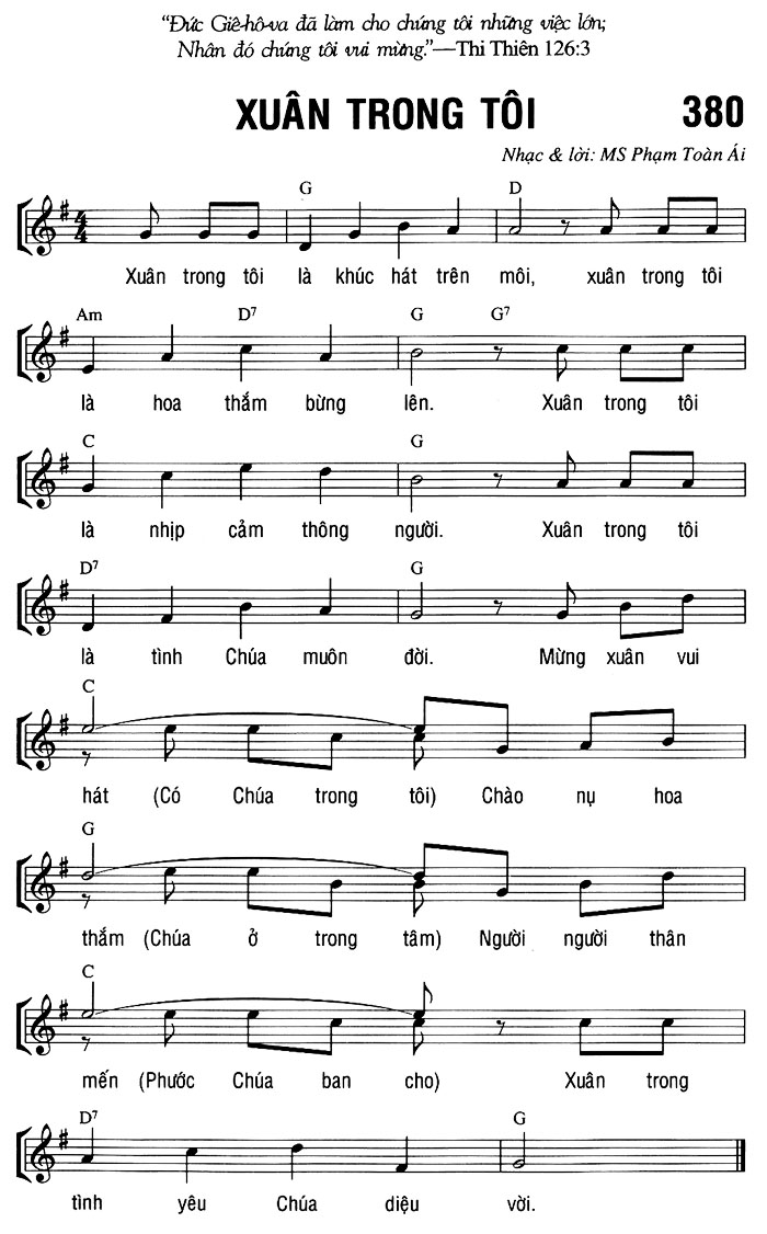 1. Xuân trong tôi là khúc hát trên môi, xuân trong tôi là hoa thắm bừng lên. Xuân trong tôi là nhịp cảm thông người. Xuân trong tôi là tình Chúa muôn đời. Điệp khúc: Mừng xuân vui hát (Có Chúa trong tôi) Chào nụ hoa thắm (Chúa ở trong tâm) Người người thân mến (Phước Chúa ban cho) Xuân trong tình yêu Chúa diệu vời.