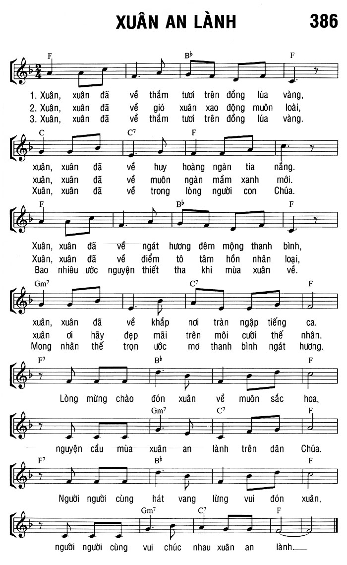 1. Xuân, xuân đã về thắm tươi trên đồng lúa vàng, xuân, xuân đã về huy hoàng ngàn tia nắng. Xuân, xuân đã về ngát hương đêm mộng thanh bình, xuân, xuân đã về khắp nơi tràn ngập tiếng ca. 2. Xuân, xuân đã về gió xuân xao động muôn loài, xuân, xuân đã về muôn ngàn mầm xanh mới. Xuân, xuân đã về điểm tô tâm hồn nhân loại, xuân ơi hãy đẹp mãi trên môi cười thế nhân. 3. Xuân, xuân đã về thắm tươi trên đồng lúa vàng. Xuân, xuân đã về trong lòng người con Chúa. Bao nhiêu ước nguyện thiết tha khi mùa xuân về. Mong nhân thế trọn ước mơ thanh bình ngát hương. chorus. Lòng mừng chào đón xuân về muôn sắc hoa, nguyện cầu mùa xuân an lành trên dân Chúa. Người người cùng hát vang lừng vui đón xuân, người người cùng vui chúc nhau xuân an lành. Điệp khúc: Lòng mừng chào đón xuân về muôn sắc hoa, nguyện cầu mùa xuân an lành trên dân Chúa. Người người cùng hát vang lừng vui đón xuân, người người cùng vui chúc nhau xuân an lành.