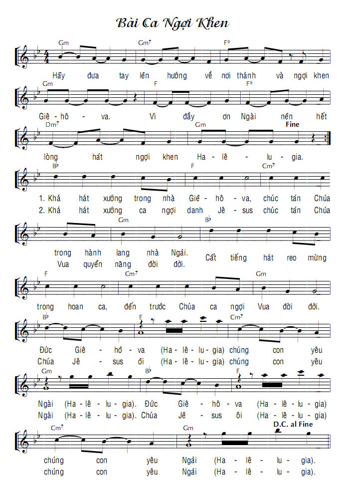 1. Hãy đưa tay lên hướng về nơi thánh và ngợi khen Giê-hô-va. Vì đầy ơn Ngài nên hết lòng hát ngợi khen Ha-lê-lu-gia. Khá hát xướng trong nhà Giê-hô-va, chúc tán Chúa trong hành lang nhà Ngài. Cất tiếng hát reo mừng trong hoan ca, đến trước Chúa ca ngợi Vua đời đời. 2. Hãy đưa tay lên hướng về nơi thánh và ngợi khen Giê-hô-va. Vì đầy ơn Ngài nên hết lòng hát ngợi khen Ha-lê-lu-gia. Khá hát xướng ca ngợi danh Jê-sus chúc tán Chúa Vua quyền năng đời đời. Cất tiếng hát reo mừng trong hoan ca, đến trước Chúa ca ngợi Vua đời đời. Điệp khúc: Đức Giê-hô-va (Ha-lê-lu-gia) chúng con yêu Ngài (Ha-lê-lu-gia). Chúa Jê-sus ôi (Ha-lê-lu-gia) chúng con yêu Ngài (Ha-lê-lu-gia).