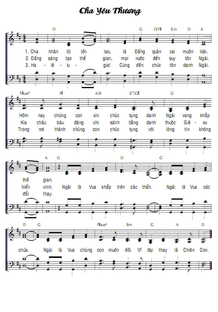 1. Cha nhân từ lớn lao, là Đấng quản cai muôn loài. Hôm nay chúng con xin chúc tụng danh Ngài vang khắp thế gian. Ngài là Vua khắp trên các thần. Ngài là Vua các chúa. Ngài là Vua chúng con muôn đời. Vĩ đại thay là Chiên Con. 2. Đấng sáng tạo thế gian, mọi nước đến suy tôn Ngài. Kia châu báu đáng chi sánh bằng danh thuộc Giê-xu hiển vinh. Ngài là Vua khắp trên các thần. Ngài là Vua các chúa. Ngài là Vua chúng con muôn đời. Vĩ đại thay là Chiên Con. 3. Ha-lê-lu-gia! Cùng đến chúc tôn danh Ngài. Trong nơi thánh chúng con chúc tụng với lòng tin không đổi thay. Ngài là Vua khắp trên các thần. Ngài là Vua các chúa. Ngài là Vua chúng con muôn đời. Vĩ đại thay là Chiên Con.