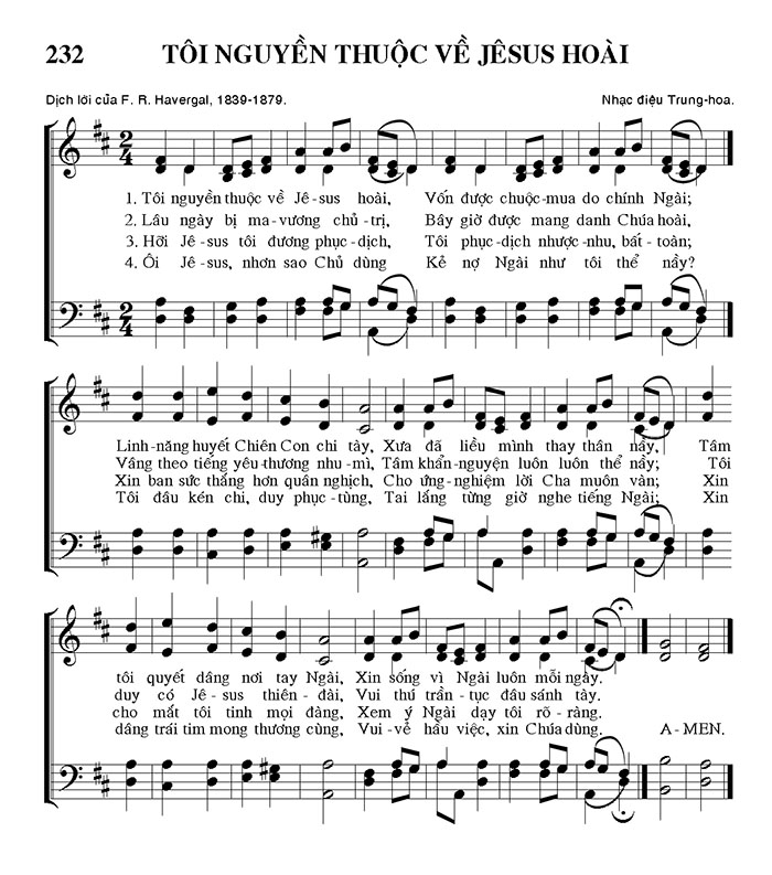 1. Tôi nguyền thuộc về Jê-sus hoài, Vốn được chuộc-mua do chính Ngài; Linh-năng huyết Chiên Con chi tầy, Xưa đã liều mình thay thân nầy; Tôi quyết dâng nơi tay Ngài, Xin sống vì Ngài luôn mỗi ngày. 2. Lâu ngày bị ma-vương chủ-trị, Bây giờ được mang danh Chúa hoài; Vâng theo tiếng yêu-thương nhu-mì, Tâm khấn-nguyện luôn luôn thế này; Duy có Jê-sus thiên-đài, Vui thứ trần-tục đau sánh tày. 3. Hỡi Jê-sus tôi đương phục-dịch, Tôi phục-dịch nhưnhư bất-toàn; Xin ban sức thắng hơn quân nghịch, Cho ứng-nghiệm lời Cha muốn xin; Cho mất tôi tình mọi đàng, Xem ý Ngài dạy tôi rõ-ràng. 4. Ôi Jê-sus, nhân sao Chúa dùng Kẻ nợ Ngài như tôi thế này? Tôi đâu kén chi, duy phục-tùng, Tai lắng từng giờ nghe tiếng Ngài; Dâng trái tim mong thương cùng, Vui-vẻ hầu việc, xin Chúa dùng.