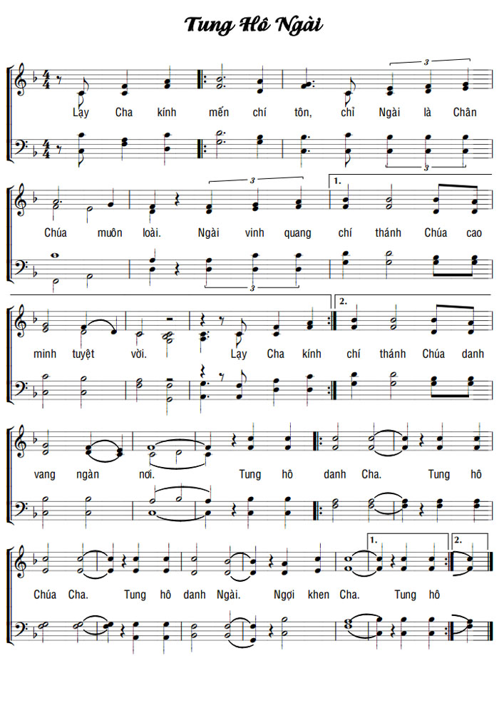 1. Lạy Cha kính mến chí tôn, chỉ Ngài là Chân Chúa muôn loài. Ngài vinh quang chí thánh Chúa cao Chúa Cha. Tung hô danh Ngài. Ngợi khen Cha. Tung hô 2. minh tuyệt vời. Lạy Cha kính chí thánh Chúa danh vang ngàn nơi. Tung hô danh Cha. Tung hô