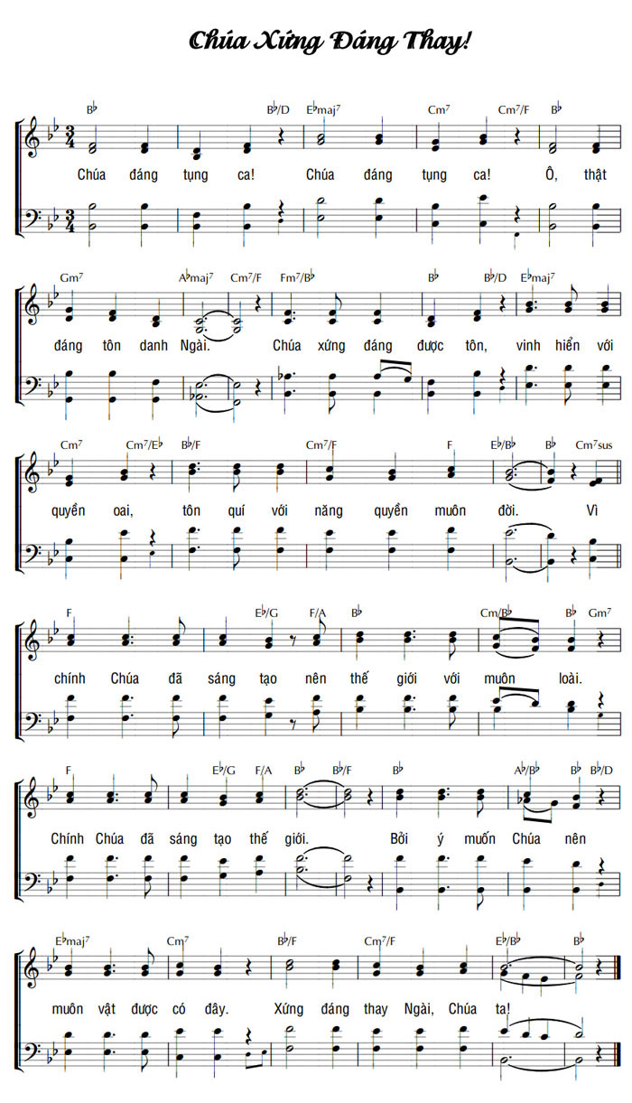 1. Chúa đáng tụng ca! Chúa đáng tụng ca! Ô, thật đáng tôn danh Ngài. Chúa xứng đáng được tôn, vinh hiển với quyền oai, tôn quí với năng quyền muôn đời. Vì chính Chúa đã sáng tạo nên thế giới với muôn loài. Chính Chúa đã sáng tạo thế giới. Bởi ý muốn Chúa nên muôn vật được có đây. Xứng đáng thay Ngài, Chúa ta!