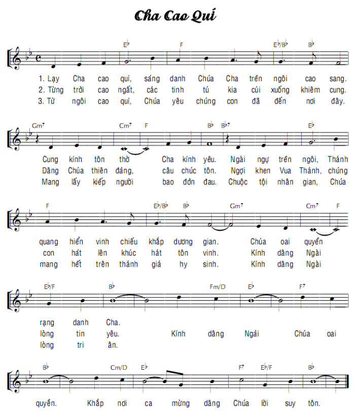 1. Lạy Cha cao quí, sáng danh Chúa Cha trên ngôi cao sang. Cung kính tôn thờ Cha kính yêu. Ngài ngự trên ngôi, Thánh quang hiển vinh chiếu khắp dương gian. Chúa oai quyền rạng danh Cha. Khắp nơi ca mừng dâng Chúa lời suy tôn. 2. Từng trời cao ngất, các tinh tú kia cúi xuống khiêm cung. Dâng Chúa thiên đàng, câu chúc tôn. Ngợi khen Vua Thánh, chúng con hát lên khúc hát tôn vinh. Kính dâng Ngài lòng tin yêu. 3. Từ ngôi cao quí, Chúa yêu chúng con đã đến nơi đây. Mang lấy kiếp người bao đớn đau. Chuộc tội nhân gian, Chúa mang hết trên thánh giá hy sinh. Kính dâng Ngài lòng tri ân.
