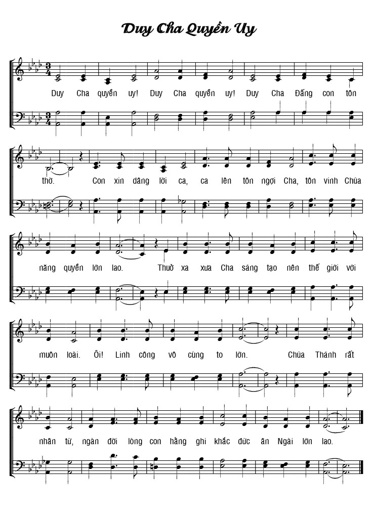 1. Duy Cha quyền uy! Duy Cha quyền uy! Duy Cha Đấng con tôn thờ. Con xin dâng lời ca, ca lên tôn ngợi Cha, tôn vinh Chúa năng quyền lớn lao. Thuở xa xưa Cha sáng tạo nên thế giới với muôn loài. Ôi! Linh công vô cùng to lớn. Chúa Thánh rất nhân từ, ngàn đời lòng con hằng ghi khắc đức ân Ngài lớn lao.