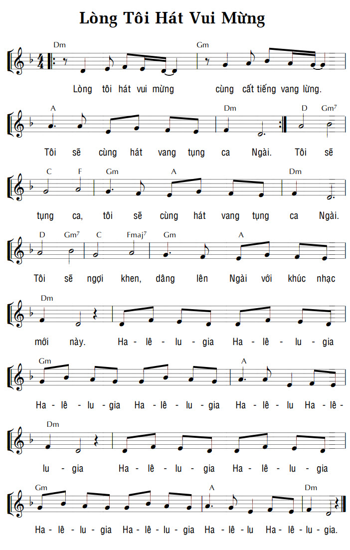 1. Lòng tôi hát vui mừng cùng cất tiếng vang lừng. Tôi sẽ cùng hát vang tụng ca Ngài. Tôi sẽ tụng ca, tôi sẽ cùng hát vang tụng ca Ngài. Tôi sẽ ngợi khen, dâng lên Ngài với khúc nhạc mới này. Điệp khúc: Ha-lê-lu-gia Ha-lê-lu-gia Ha-lê-lu Ha-lê-lu-gia Ha-lê-lu-gia Ha-lê-lu-gia Ha-lê-lu Ha-lê-lu-gia Ha-lê-lu-gia Ha-lê-lu Ha-lê-lu-gia.